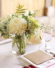 The use of the mason jar ties in a country chic and elegant look all in one! If your style is more county, wrap a strand of burlap with your initial incorporated. Or, if your style is more finished and elegant, include a silk ribbon in a soft, earthy color. Using this idea not only looks great, but it is very inexpensive! You can buy mason jars by the case at craft stores, like Hobby Lobby. Beats spending hundreds on glass vases you will probably never use again (like I did!) and you can use the mason jars for lots of other crafts, gifts, etc. after the wedding! Perfect :)